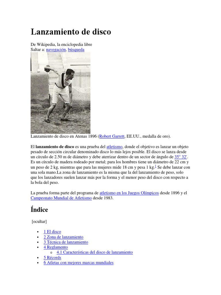 I n the discus throwing he manages to remove the hat of the univer sity dean. En 1414, nació el lanzamiento del disco como hoy se conoce. Enterate todo lo que tenés que saber sobre el lanzamiento de disco, uno de los deportes que vas a poder ver en nuestro parque olímpico de la juventud. El lanzamiento de disco es una prueba del atletismo, donde el objetivo es lanzar un objeto pesado de sección circular denominado disco, lo mas lejos posible. Enel último cuarto del siglo xix ya se.